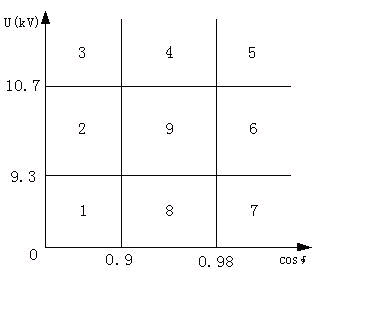电压无功综合控制原理按系统电压无功构成的九区图进行控制,电压上、下限可按GB12325-1990标准整定,以10kV为例,系统上限可为10.7kV,下限为9.3kV;无功以功率因数为判据,按要求110kV变电站COSΦ应不低于0.95,可为下限,上限为0.98,以不向系统倒无功为准。无功(COSΦ)九区图如下图所示: