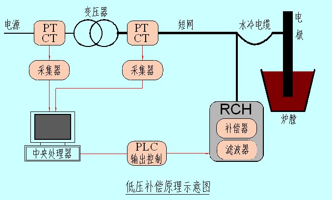 矿热炉二次低压补偿是属于将原成熟的就地补偿技术应用到矿热炉的二次低压侧,利用现代控制技术和短网技术将大容量,大电流的超低压电力电容器组接入矿热炉二次侧的无功补偿装置。大量无功电流将直接经低压电容器回路流转,从而不再经过补偿点前的短网、变压器及供电网路,在提高功率因数的同时,提高变压器的有功输出率,降低变压器、短网的无功消耗。该装置不仅是就地补偿原理的最好体现,还可以使矿热炉的功率因数在0.92以上运行、降低短网和一次侧的无功消耗、消除5次、7次谐波、调平三相功率、提高变压器的输出能力。控制的设计重点采用分相动态补偿,使三相功率不平衡度下降,达到三相功率相等,使电石炉的功率中心和炉膛中心相重合,使钳锅扩大,热量集中,提高炉面温度,使反应加快,达到提高产品质量,降耗和增产的目的。DYH矿热炉动态无功功率补偿装置补偿技术,无论在提高功率因数、吸收谐波,还是在增产降耗、改善指标的效果上,都有着高压补偿无法比拟的优势。属可靠、成熟技术。
